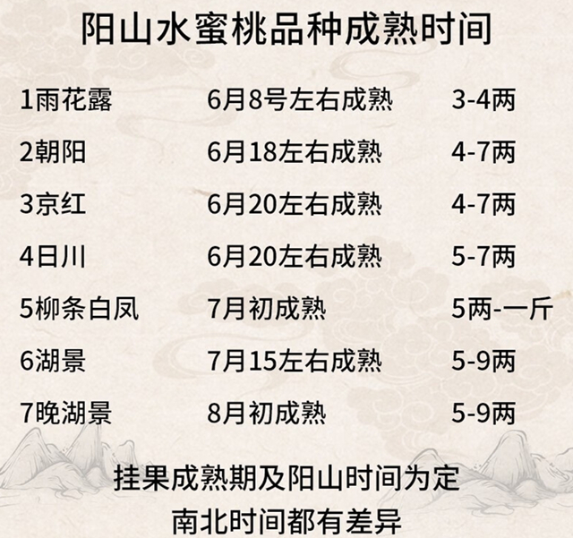 中熟品种是六月份到七月上旬上市,主要品种有湖景桃、阳山蜜露等。